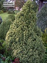 5...7 m kõrgune tihe teravatipuline koonus, noor kasv kuldkollane, hiljem sidrunkollane |